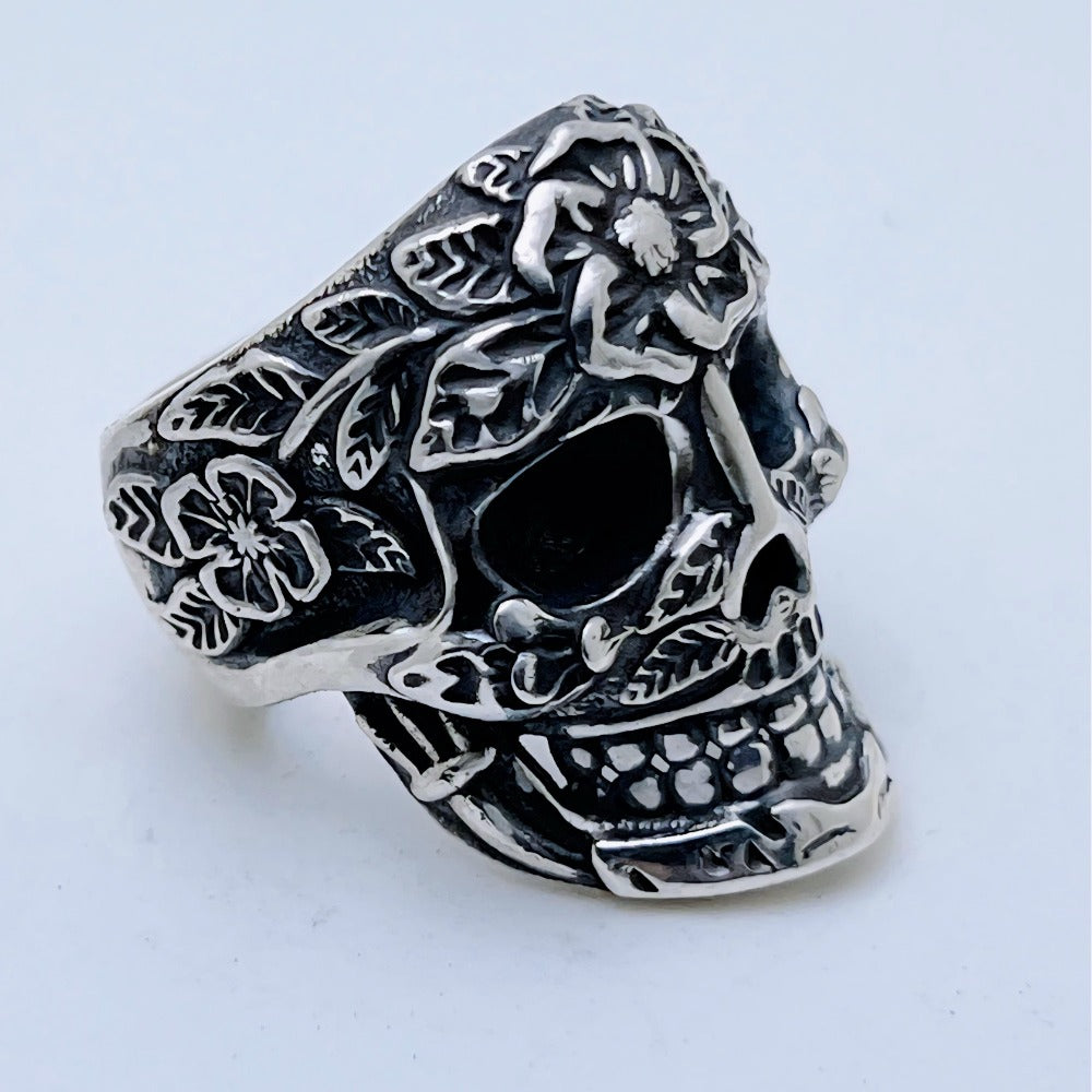 A sculpted skull wrapped in flowers and leaves, with deep black shadows and bright silver highlights. This ring mixes dark and delicate – perfect for rock, gothic, biker or anyone who wants a unique sugar-skull style piece in real silver.